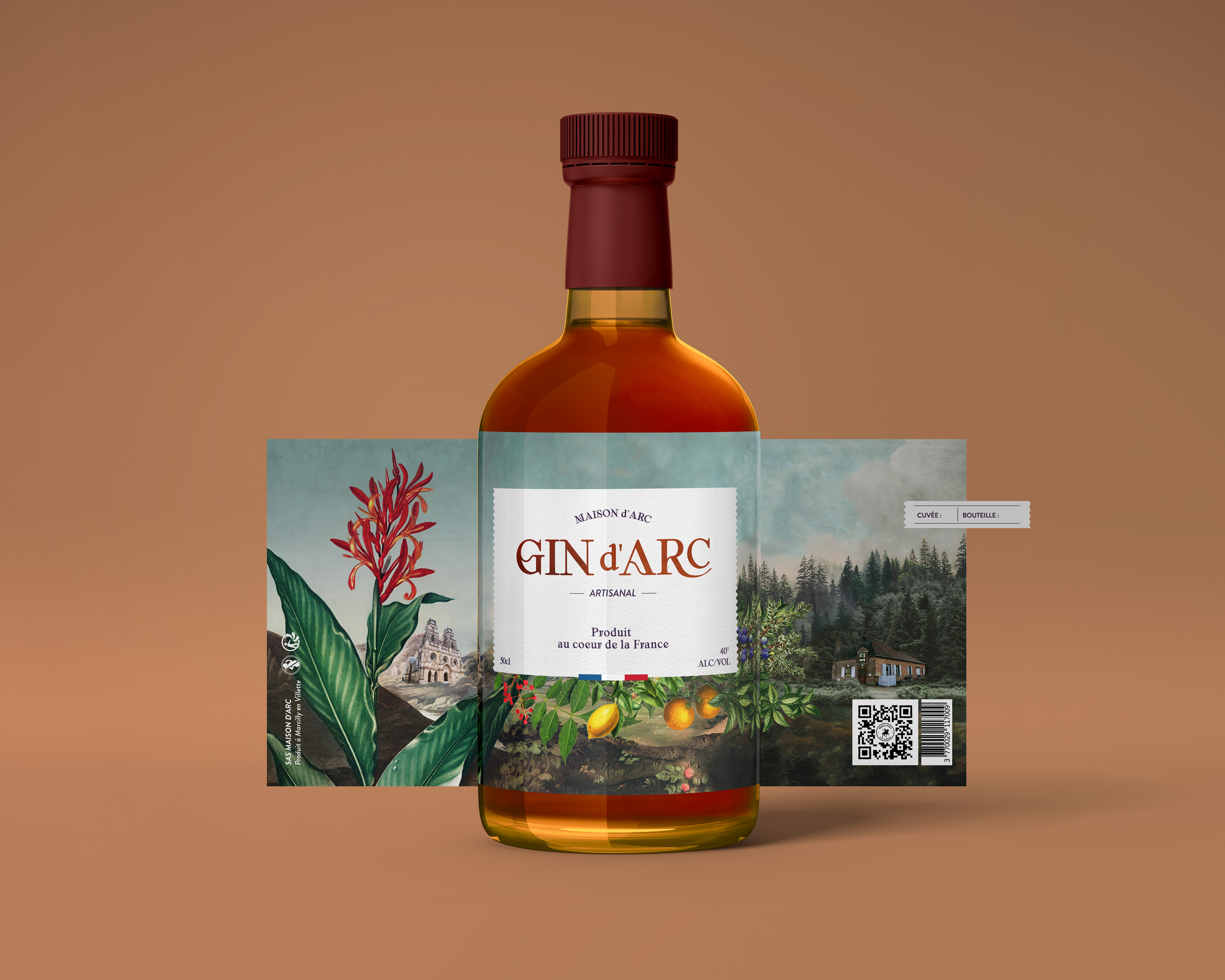 L’illustration a été crée à base d’un collage subtil, évoquant le contexte et la beauté des alentours de la Maison d’Arc, en un mélange de fantaisie et de réalité. La Cathédrale d’Orléans d’un côté, la maison d’Arc (typique de la région naturelle de Sologne) recouverte de fôrets giboyeuses et de nombreux étangs. En premier plan, on y trouve les ingrédients indispensables de ce GIN : la baie de GENIEVRE, les AGRUMES, et le poivre de SICHUAN rouge.